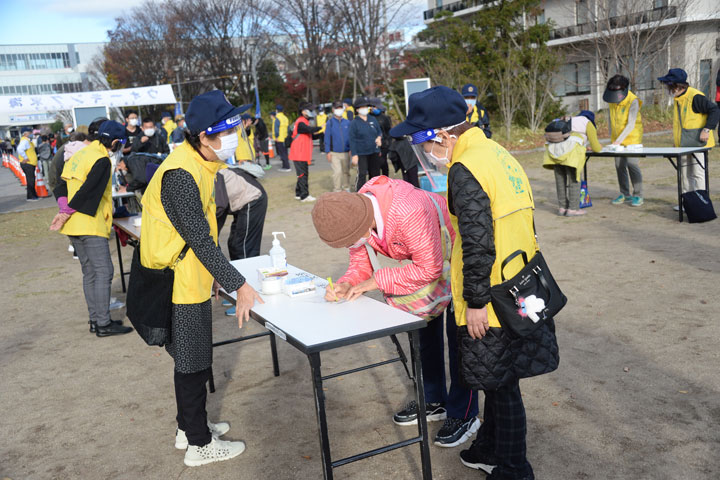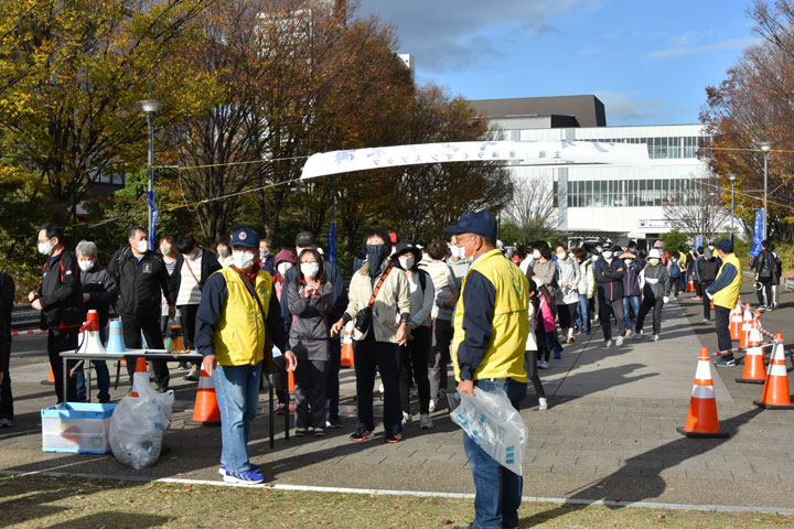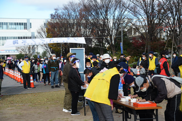 「検温・マスク・消毒・健康調査記入」等の協力を求め、密にならない人数の塊でスタートをしました。 小さな子を含むファミリーから高齢者まで、秋晴れの下、良い汗を掻いていただきました。