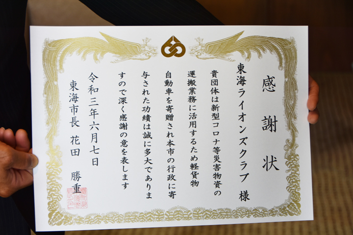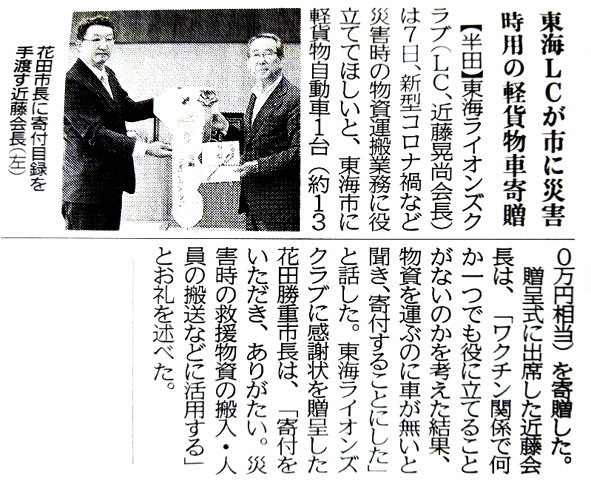 日 時 2021年6月7日(月) 13:30 場 所 東海市長応接室 新型コロナ等災害物資の運搬業務に役立てていただくもの 「コロナ禍」で例会及び事業等が縮小されました。 そこで、何か役だてていただけるものはないかと考えていたところ、市健康推進課より 「新型コロナ等災害時の物資運搬」をする車が不足している旨のお話がありましたので、 「軽貨物自動車」を寄贈することにしました。 市民の皆さんに役立てていただくことを期待します。