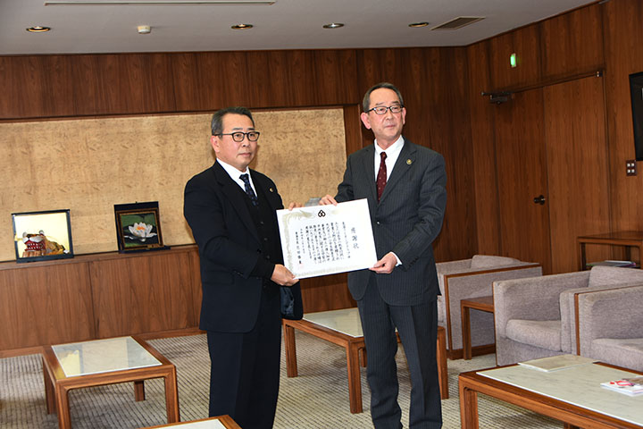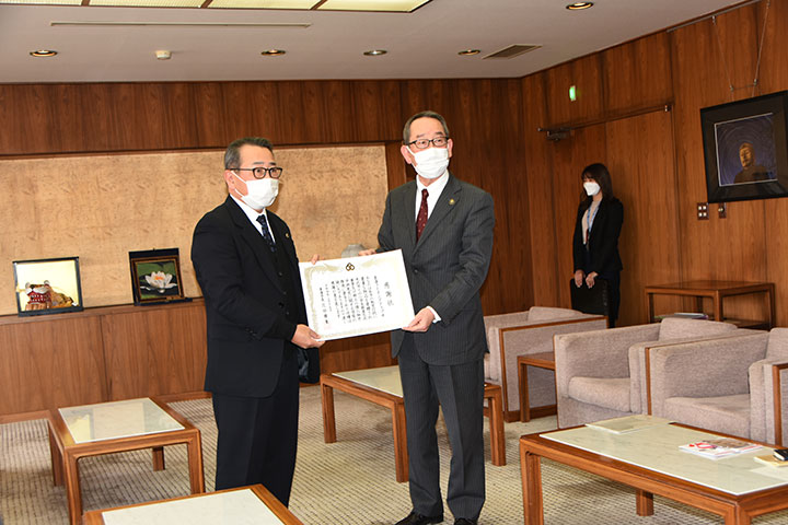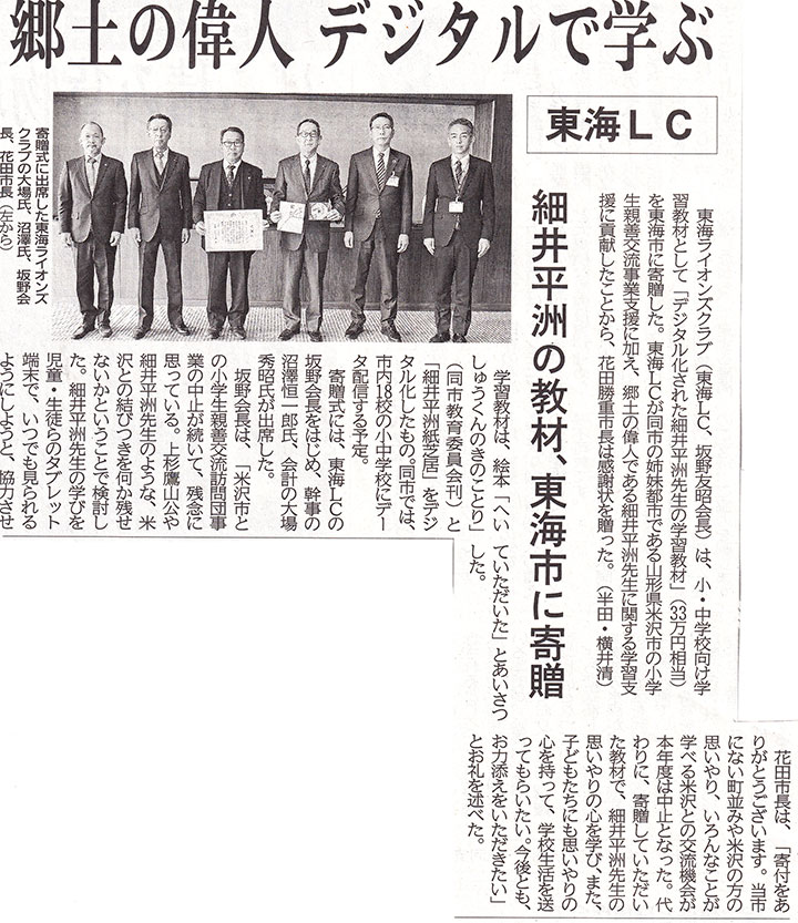 場 所 東海市長応接室 内 容 米沢市・東海市小学生交流訪問団事業が本年度も「コロナ禍」のため中止となりました。 小学生親善交流事業は中止となりましたが、米沢市との小学生親善交流事業及び細井平洲先生に 関する学習に役立てていただきたく下記のもを寄贈しました。